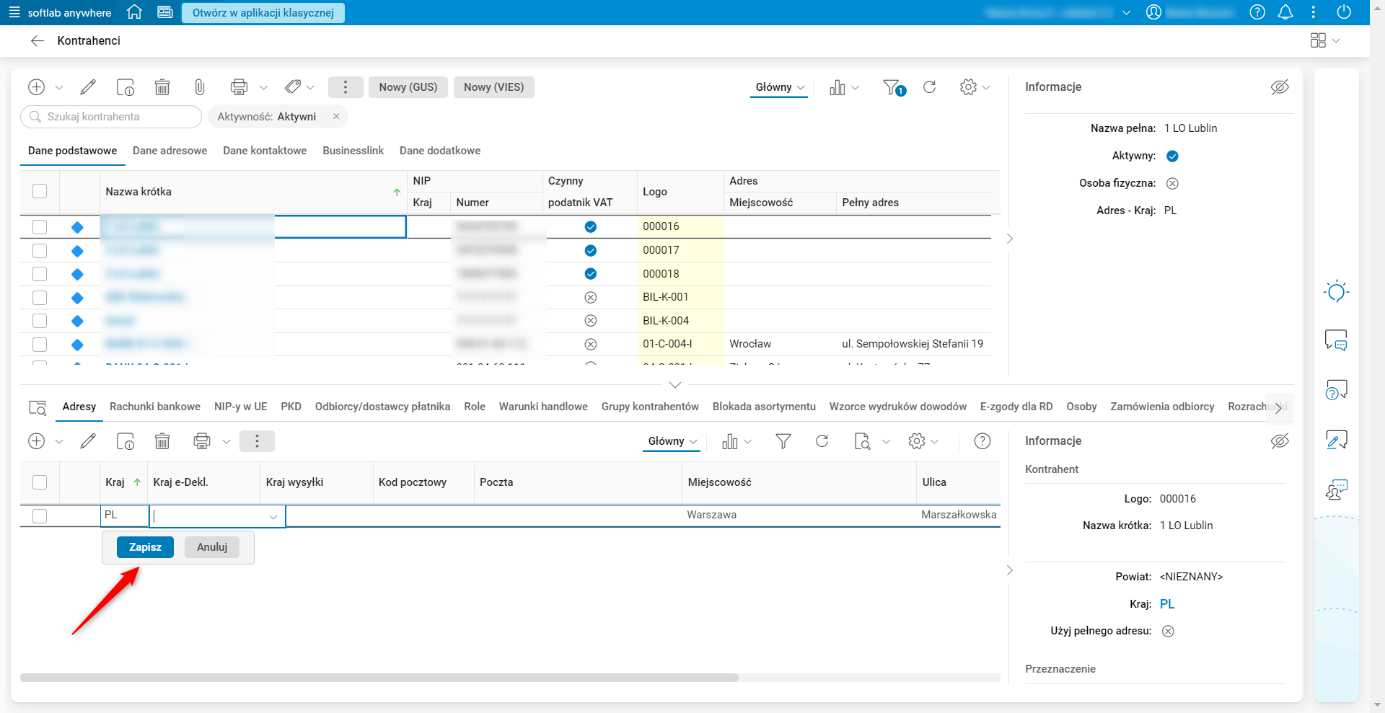 Rys. 7. Przykład uzupełnienia pól danymi w tabeli, w aplikacji Softlab HTML i wskazanie przycisku Zapisz