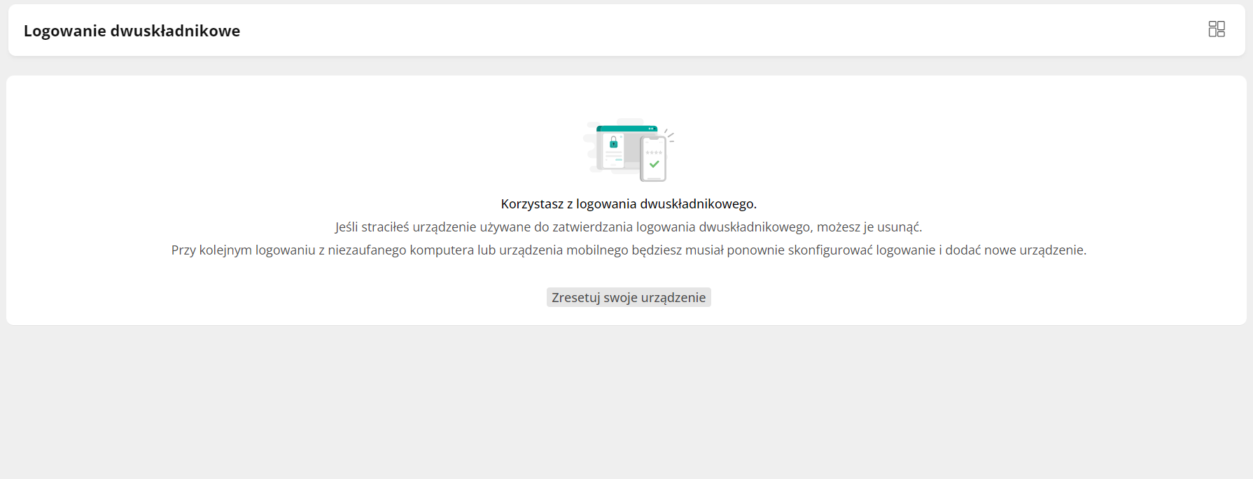 Na pulpicie użytkownik może zresetować urządzenie, którego używa do logowania dwuskładnikowego, za pomocą przycisku akcji Zresetuj swoje urządzenie. Po zatwierdzeniu tej akcji nie będzie on mógł zalogować się do portalu za pomocą dotychczasowego urządzenia, a przy kolejnym logowaniu będzie musiał dodać nowe. Jeżeli użytkownik loguje się na komputerze lub urządzeniu mobilnym, które wcześniej oznaczył jako zaufane, dodanie nowego urządzenia do logowania dwuskładnikowego wymagane będzie dopiero po upływie 3 miesięcy od tego oznaczenia.