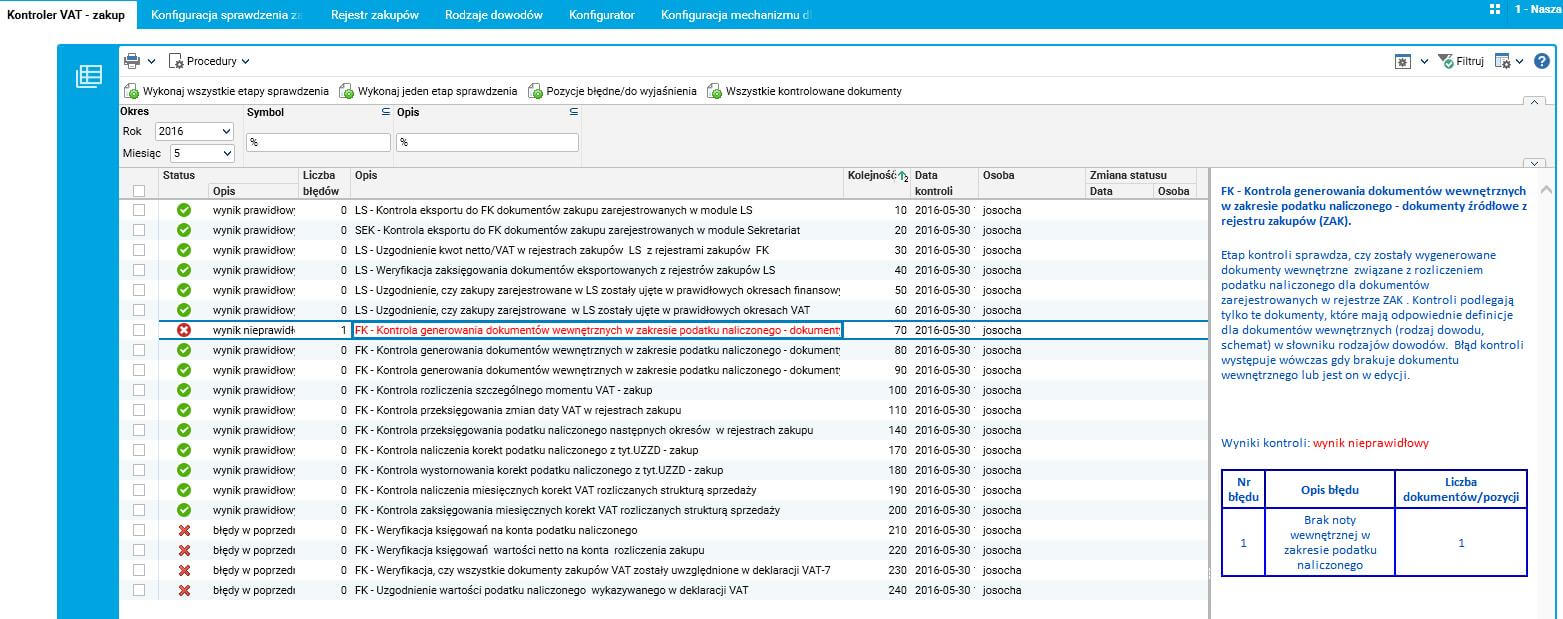 Uruchamiamy weryfikację danych VAT w maju 2016. Kontroler VAT – zakup wykazuje błąd na etapie Kontrola generowania dokumentów wewnętrznych w zakresie podatku należnego – dokumenty źródłowe z rejestru zakupów (ZAK).