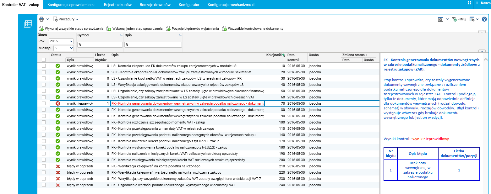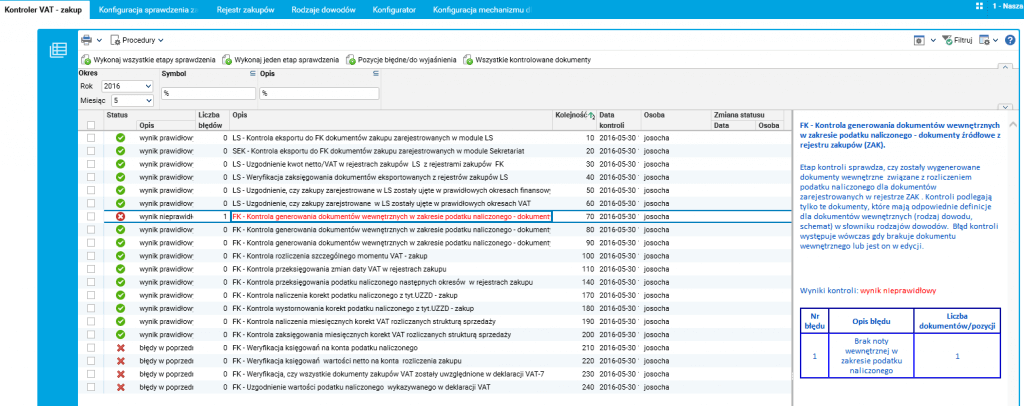 Każdy z tych etapów sprawdza, czy zostały wygenerowane odpowiednie dokumenty przeksięgowujące.