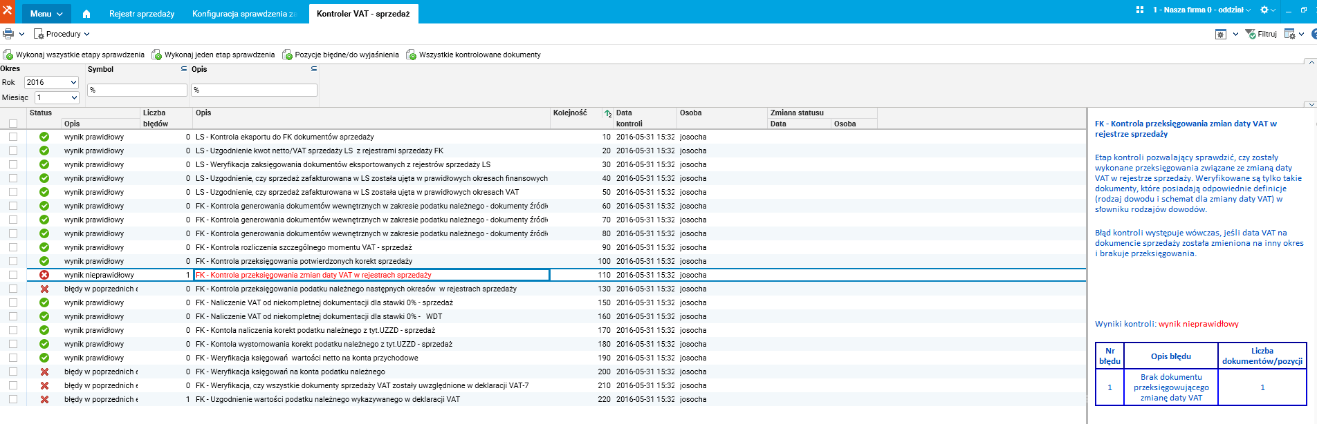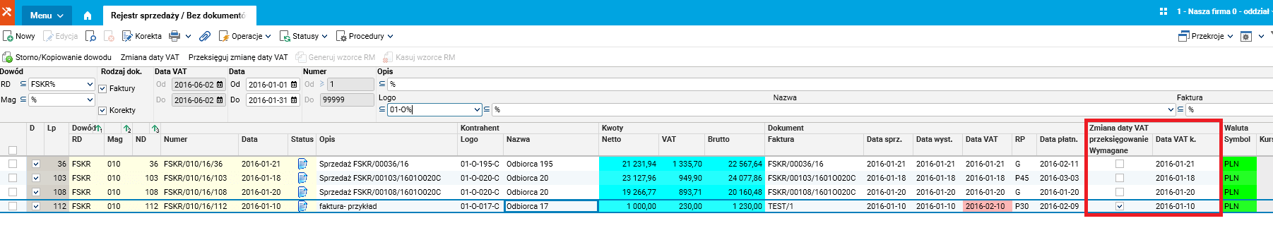 - Kontrola przeksięgowania zmian daty VAT w rejestrze sprzedaży
