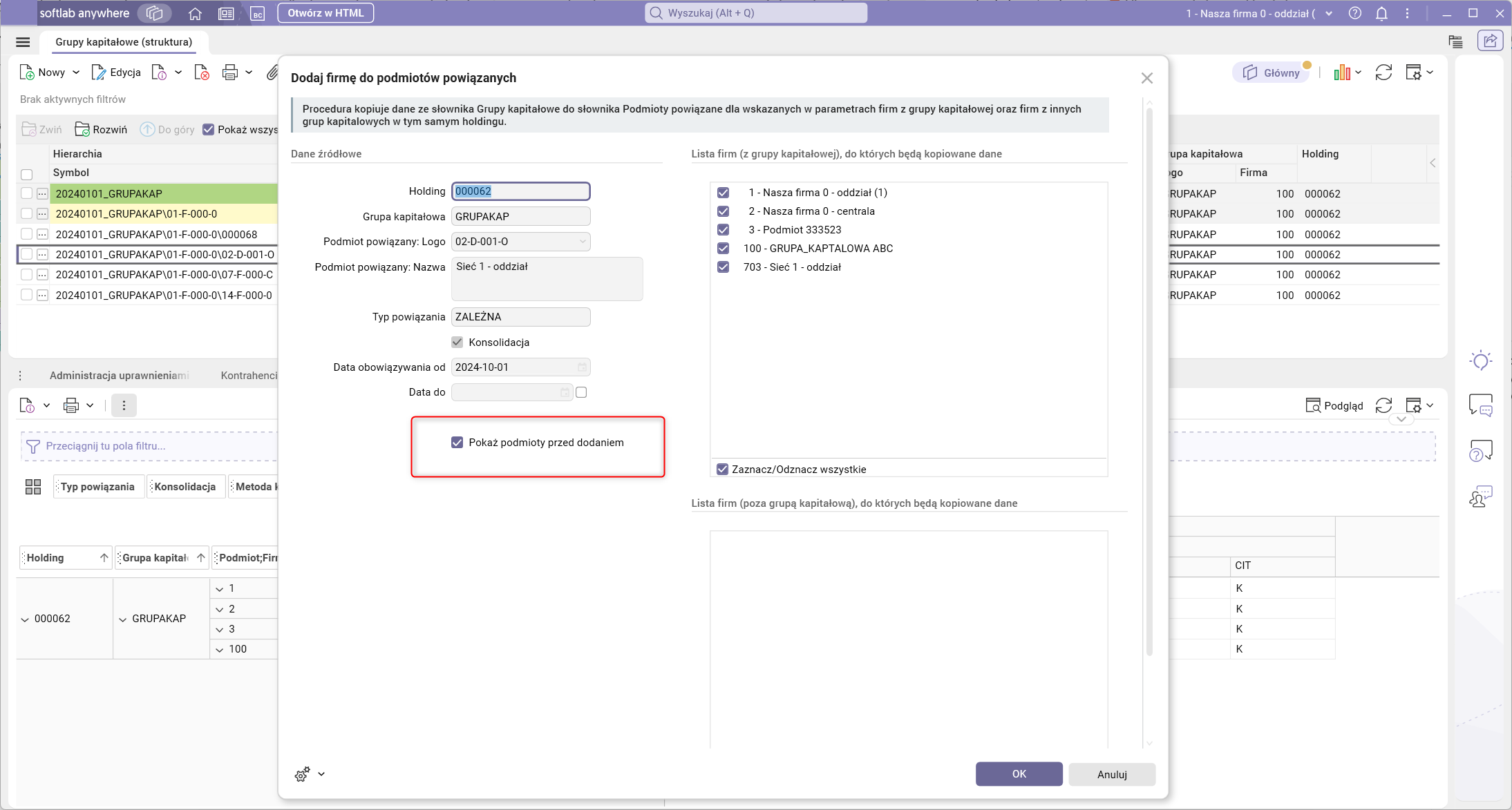 Po dodaniu podmiotu 02-D-001-O do struktury grupy należy też uruchomić procedurę Dodaj firmę do podmiotów powiązanych. Procedura ta doda do wszystkich firm w grupie kapitałowej (i ewentualnie holdingu) nowododany podmiot. W parametrach procedury zostaną wyświetlone firmy, do których podmiot powinien być dodany. W parametrach procedury dodano parametr Pokaż podmioty przed dodaniem. Jeśli parametr jest zaznaczony, to po naciśnięciu akcji OK pojawi się słownik z listą proponowanych rekordów do dodania. Jeśli parametr ten będzie odznaczony, to podmioty z listy zostaną dodane automatycznie, bez ich pokazywania.