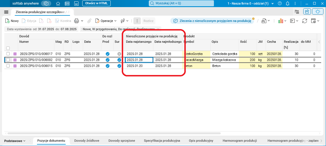 - Nierozliczone przyjęcie na produkcję;Data najmłodszego – data najpóźniejszego nierozliczonego dokumentu PWGp wystawionego do danego zlecenia ZPS.