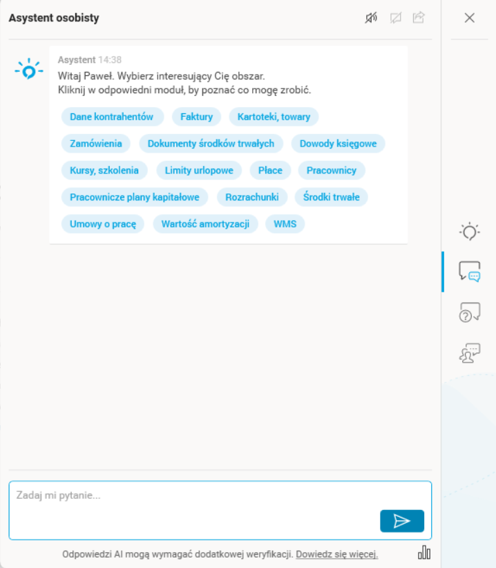 Asystent w panelu Pomoc i dokumentacja udzieli odpowiedzi w określonym kontekście, tj. po zadaniu pytania poprosi o wybranie modułu (czyli wskazanie kontekstu). Po jego wybraniu Asystent odpowie na zadane pytanie.