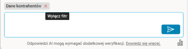 Można rozpocząć również nowy temat w aktualnej konwersacji poprzez użycie przycisku Wyłącz filtr, który pojawia się nad polem do wpisywania tekstu. Jego użycie usuwa wskazany kontekst, przez co Asystent analizując pytanie będzie szukał informacji na jego temat we wszystkich modułach. Nazwa filtra zależ od tematyki rozmowy, którą z nim prowadzimy.