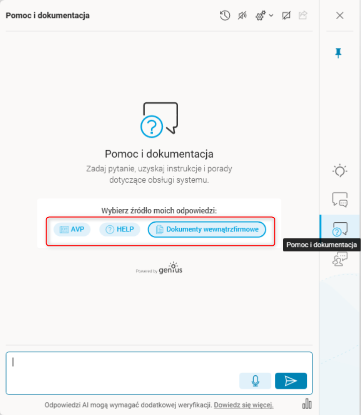 Okno konwersacji z Asystentem pomocy otwieramy klikając przycisk lub wybierając w panelu Inteligentny Asystent ERP przycisk Pomoc i dokumentacja . Po jego użyciu zostaniemy przeniesieni do okna Pomoc i dokumentacja , w którym to w pierwszym kroku musimy wybrać źródło danych, na których Asystent będzie bazował swoje odpowiedzi. Do wyboru mamy: