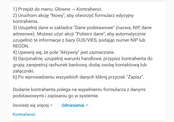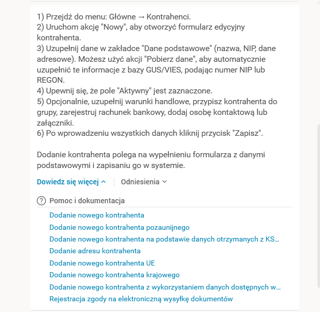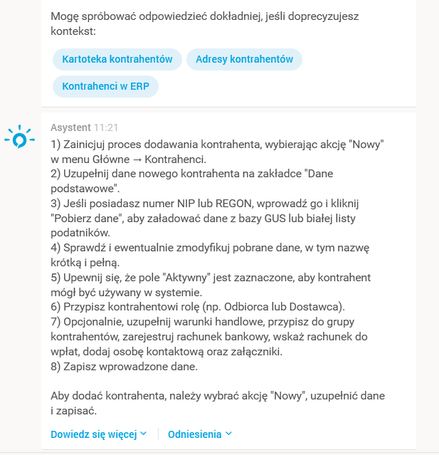 Druga odpowiedź udzielana przez Asystenta (prezentowana w formie komunikatu Mogę spróbować odpowiedzieć dokładniej, jeśli doprecyzujesz kontekst) zachęca do zawężenia kontekstu, w celu doprecyzowania udzielanej przez niego odpowiedzi. Po wybraniu jednego z dostępnych kafelków z wybranym kontekstem pytanie zostanie doprecyzowane, po czym pojawi się kolejna, zawężona do wskazanego kontekstu odpowiedź Asystenta na wcześniej zadane pytanie. Zostało to przedstawione na poniższym zrzucie ekranu – po wybraniu kontekstu Kartoteka kontrahentów, Asystent doprecyzował treść odpowiedzi oraz zmodyfikował listę źródeł.