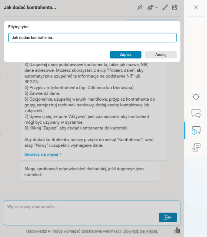 Rys. 26. Zapisana konwersacja z Asystentem z otwartą opcją zmiany tytułu