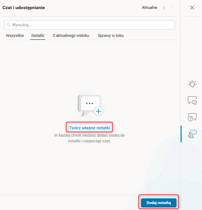 Okno czatu zostało udoskonalone i zaktualizowane. Oprócz zmiany nazwy, została dodana nowa zakładka filtrująca – Notatki. Zakładka Notatki służy do tworzenia nowych notatek oraz usuwania już istniejących (wszystkie utworzone notatki zapisują się w tej zakładce). W celu założenia nowej notatki należy w zakładce Notatki użyć akcji Dodaj notatkę lub Twórz własne notatki.