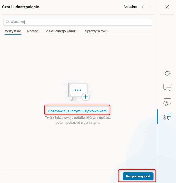 Rys. 30. Panel Czat z widocznym przyciskiem Rozpocznij czat oraz Rozmawiaj z innymi użytkownikami w aplikacji HTML
