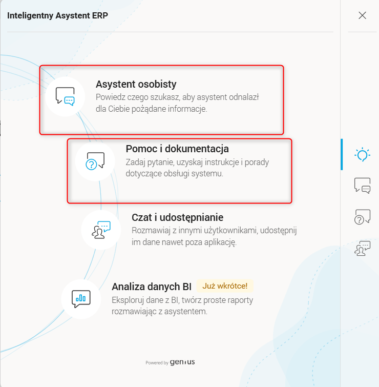 Panel Inteligentny Asystent ERP pozwala na rozpoczęcie konwersacji z jednym z dwóch Asystentów: