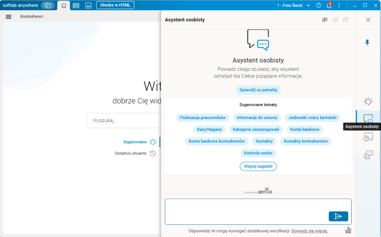 Uwzględniając aktualne trendy, w aplikacji Softlab ERP wdrożonych zostało szereg rozwiązań AI pod postacią Asystentów, bazujących na technologii Azure OpenAI. W zależności od wyboru Asystenta, mogą oni wchodzić w interakcje z systemem Softlab ERP lub odpowiadać na pytania na podstawie informacji z zasobów wiedzy pochodzących z dokumentacji systemu pomocy Softlab oraz artykułów pochodzących z serwisu AVP. Asystenci działają w formie czatbota, z którymi użytkownik może prowadzić konwersację w języku naturalnym. W zależności od wyboru Asystenta, jego celem jest wykonywanie poleceń lub udzielanie odpowiedzi na pytania zadawane przez użytkownika, dotyczące szeroko pojętego korzystania z aplikacji Softlab, np. odpowiadanie na pytania dotyczące sposobu zmiany hasła lub wystawienia faktury.