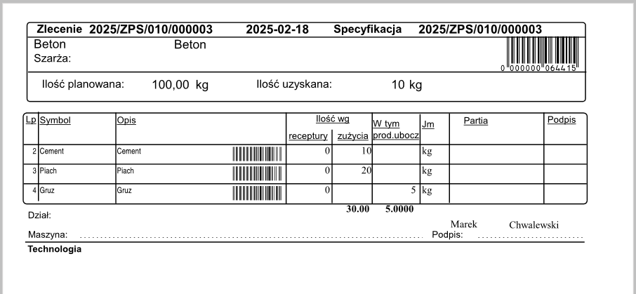 Sposób wyliczania ilości uzyskanej produktu głównego na wydruku zmieniono w taki sposób, aby były na nim uwzględniane przychody zarejestrowane dokumentami PWGp. Ponadto ilości zużycia surowców oraz przychodu produktów ubocznych i odpadów wraz z podsumowaniami zostały rozdzielone na dwie kolumny: Ilość wg zużycia i W tym prod. uboczne.