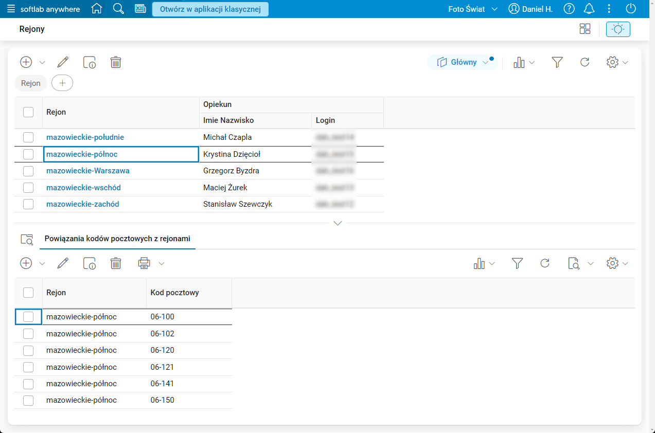 W systemie udostępniono możliwość definiowania rejonów przypisanych do operatorów pełniących rolę opiekunów oraz powiązanie tych rejonów z kodami pocztowymi.