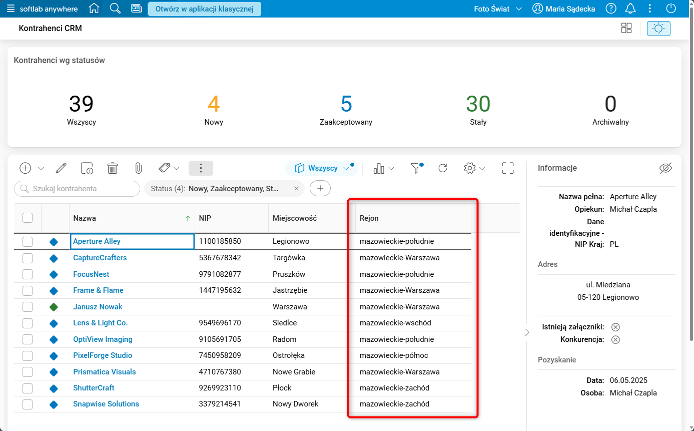 W słowniku Kontrahenci CRM dodano kolumnę Rejon (domyślnie ukryta, użytkownik może włączyć jej widoczność w ustawieniach tabeli). Wartości w kolumnie prezentują rejony przypisane do poszczególnych kontrahentów.