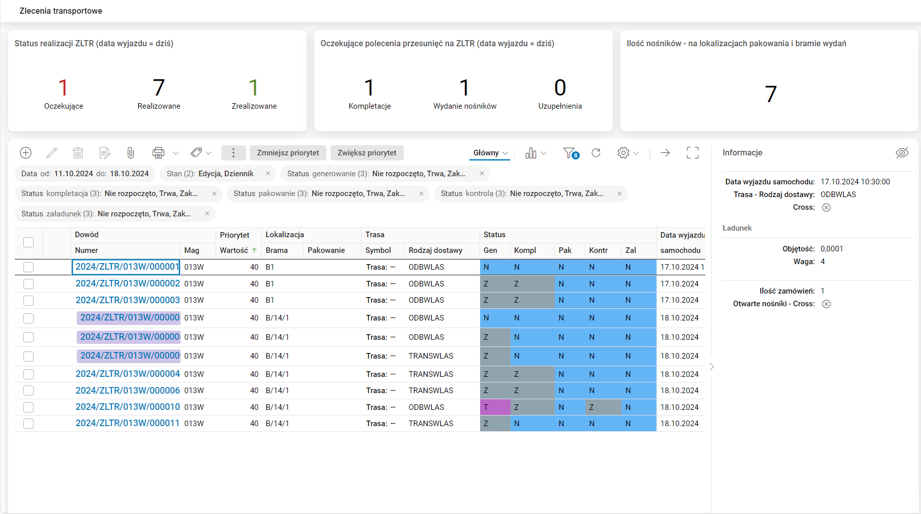 - Ilość nośników – na lokalizacjach pakowania i bramie wydań przedstawia sumaryczne dane o liczbie nośników, które są związane z realizacją ZLTR, a obecnie znajdują się na lokalizacjach przeznaczonych do pakowania lub zostały dostarczone na bramę wydań.