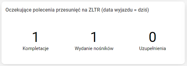 - Oczekujące polecenia przesunięć na ZLTR przedstawiający sumaryczne dane o przesunięciach w statusie Oczekujący, które są sprzężone do ZLTR, a zaplanowana data wyjazdu dla zlecenia transportowego to bieżący dzień. Komponent uwzględnia podział na polecenia związane z procesem kompletacji, wydania nośników i uzupełnień. Sumaryczna liczba oczekujących przesunięć dla procesu kompletacji wyznaczana jest na podstawie liczby dokumentów PRL, dla procesu wydania nośników na podstawie liczby dowodów PRLN, natomiast dla uzupełnień są to dokumenty PPUZ i PPU.