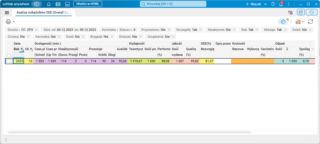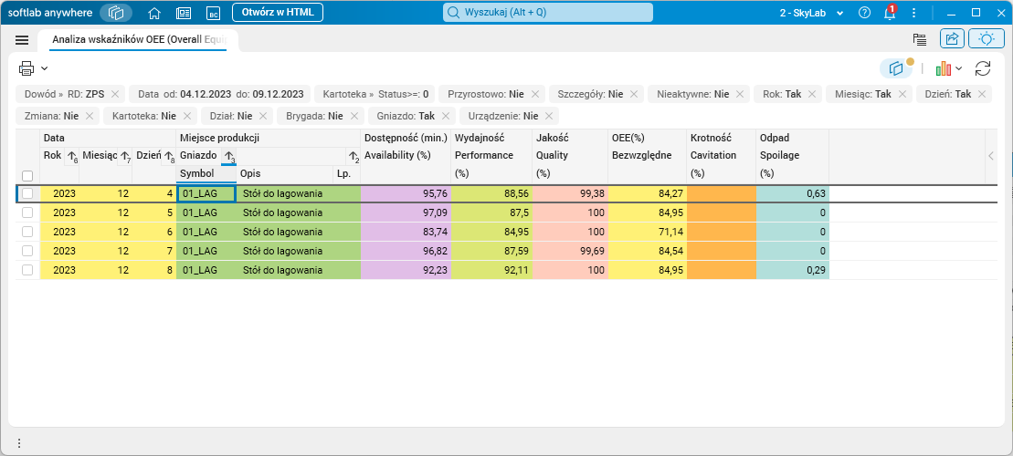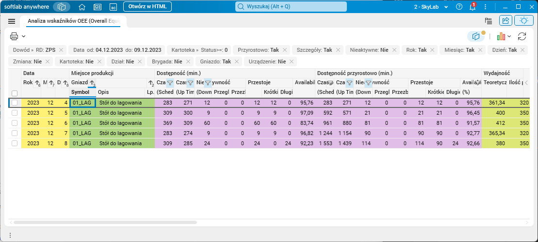 Rys. 3. Słownik Analiza wskaźników OEE, wyłączone grupowanie wg gniazd i dni