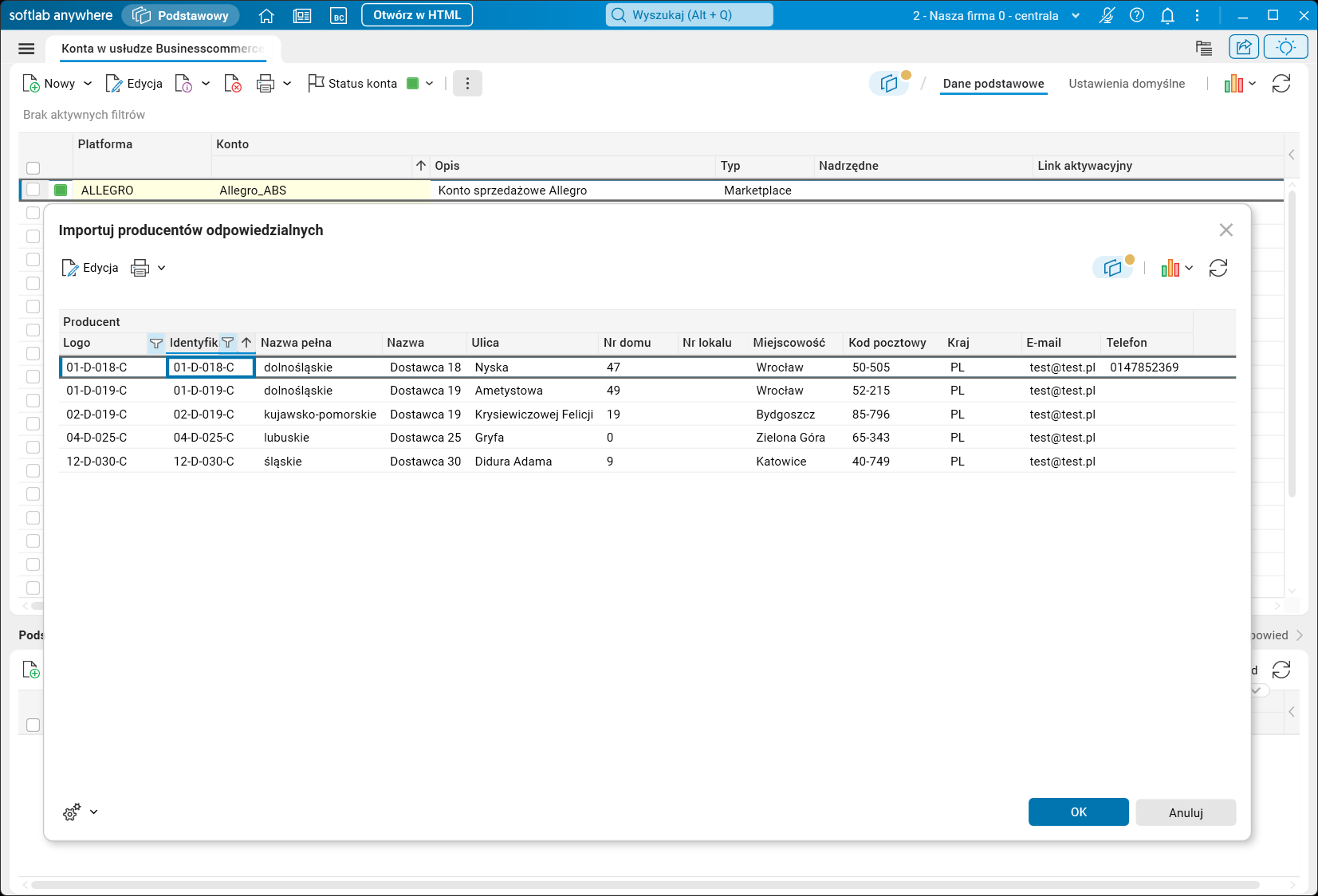 Dostosowując system Softlab ERP do zmian wynikających z rozporządzenia GPSR do słownika Konta w usłudze Businesscommerce dodano dwa szczegóły Producenci odpowiedzialni oraz Osoby odpowiedzialne. Pozwalają one na wysłanie informacji o producencie lub osobie odpowiedzialnej dla wybranego konta usługi Businesscommerce.