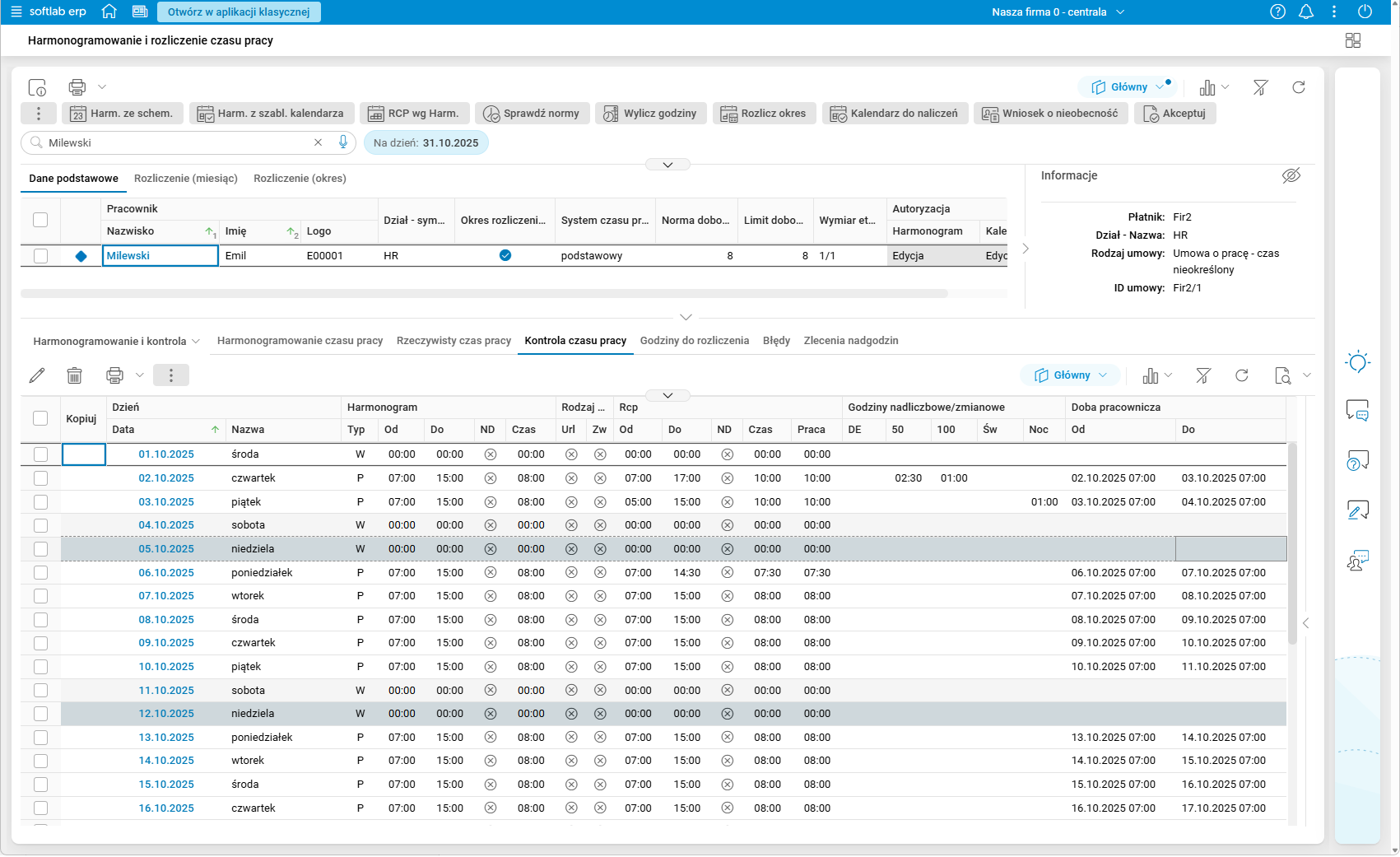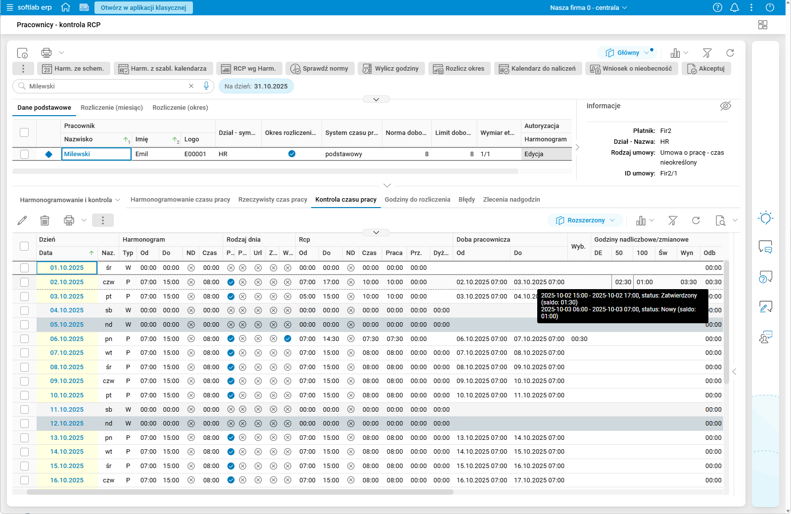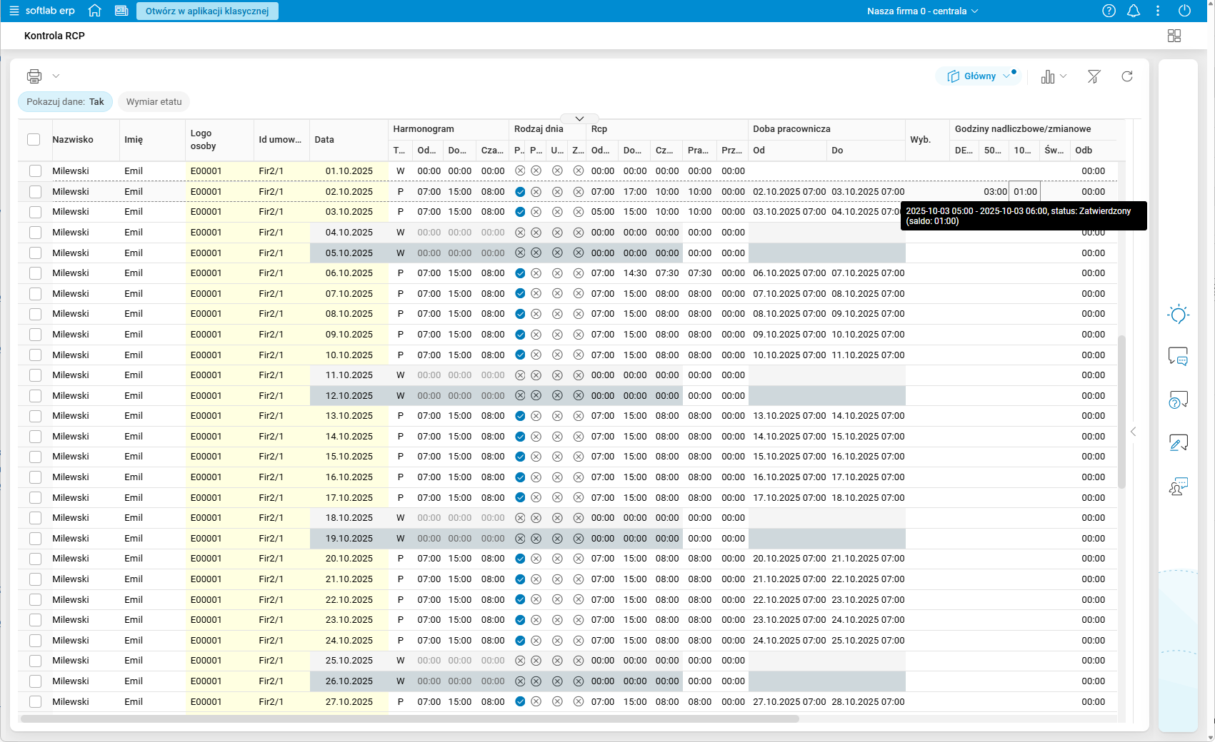 Szczegół Doby pracownicze oraz nadgodziny w przekroju Miesięczny prezentuje dane tylko z bieżącego miesiąca.