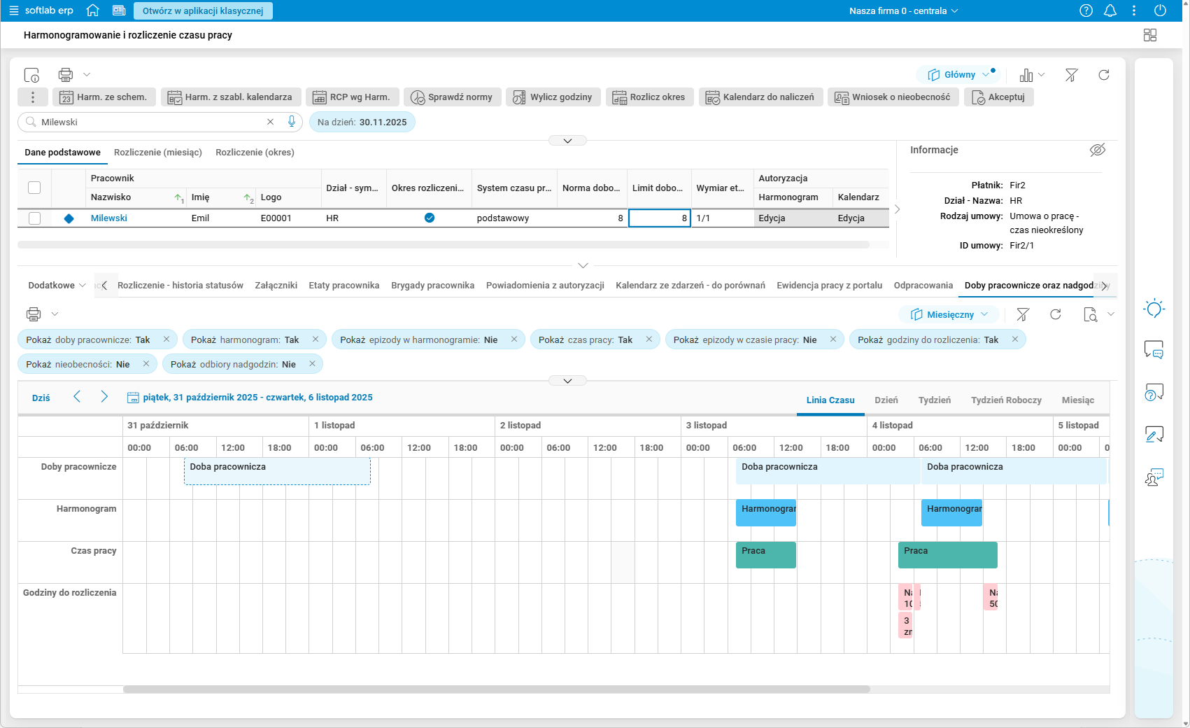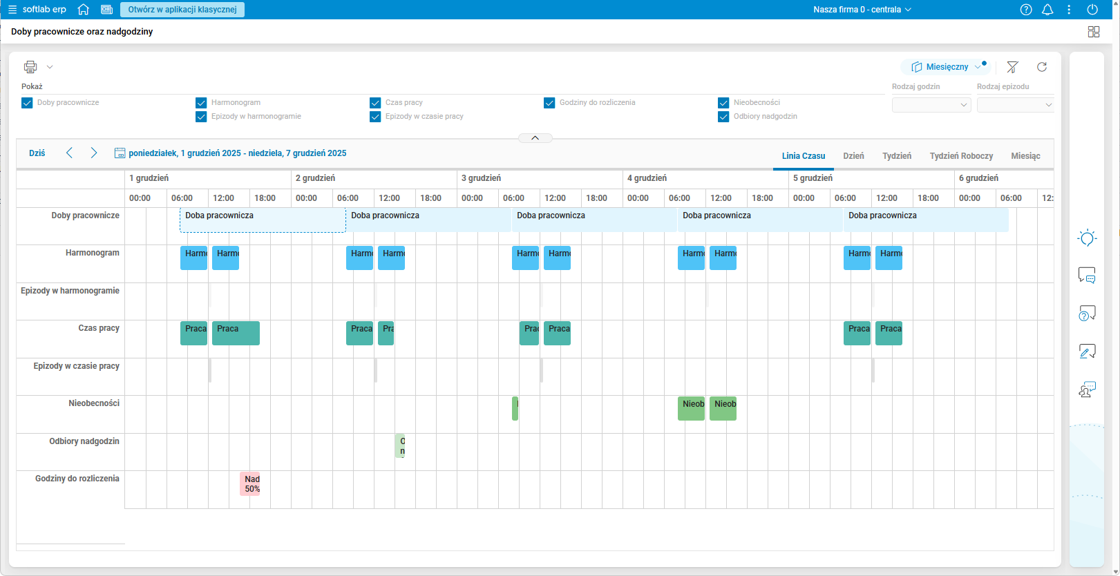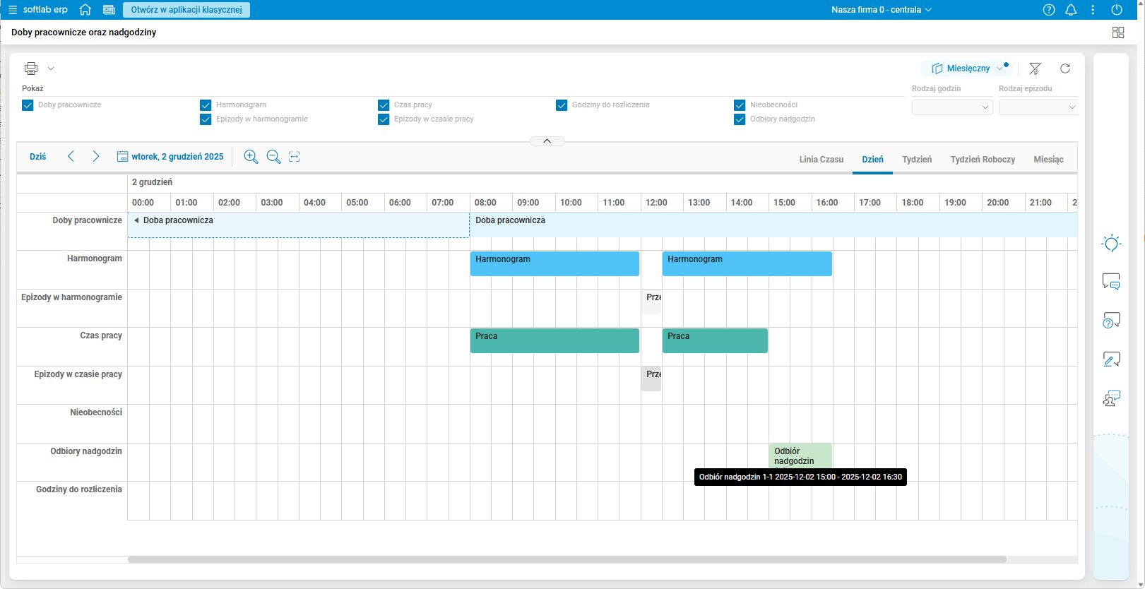Rys. 15. Podgląd szczegółu Doby pracownicze oraz nadgodziny – włączone wszystkie filtry rodzajów godzin – zakładka Linia czasu
