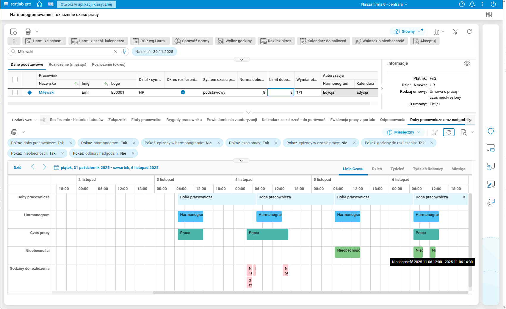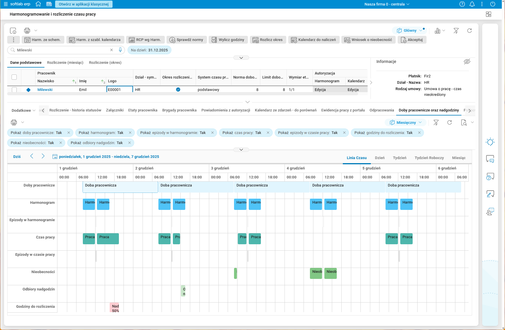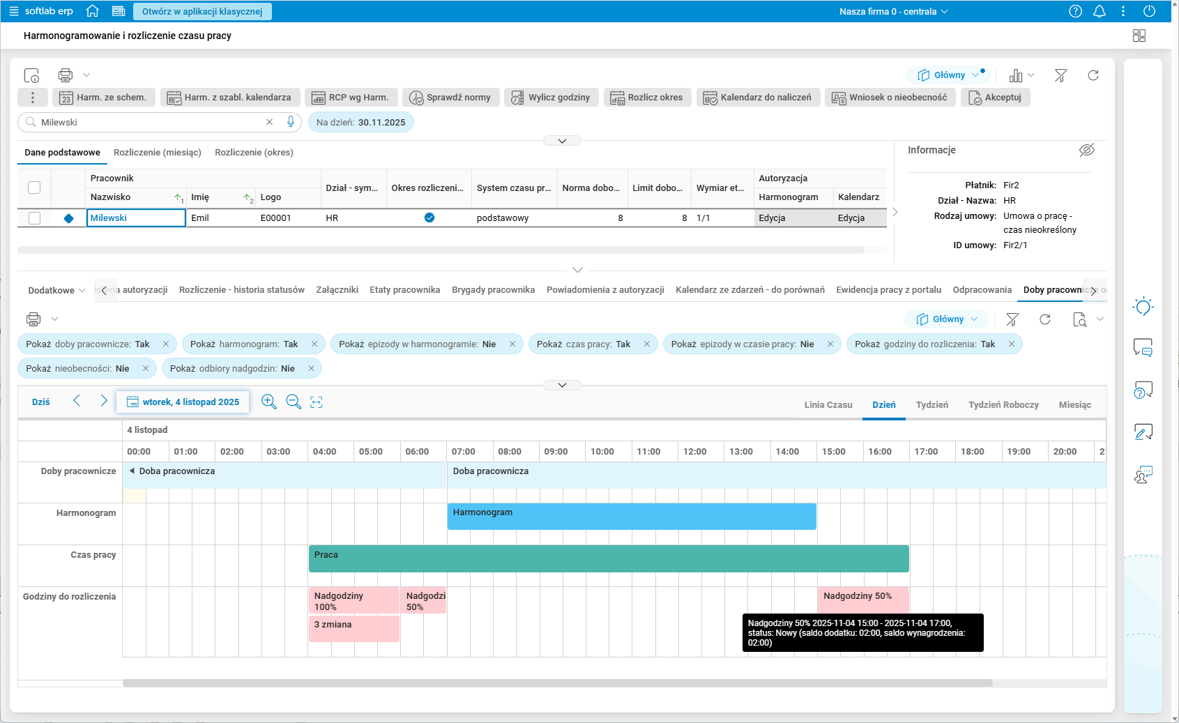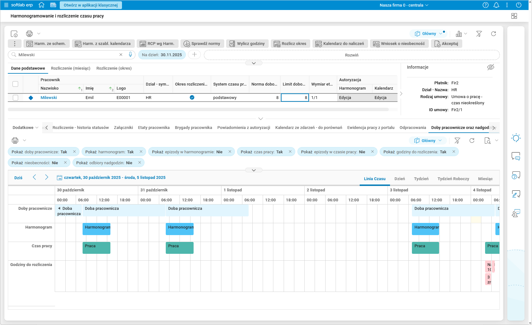 Rys. 15. Podgląd szczegółu Doby pracownicze oraz nadgodziny – włączone wszystkie filtry rodzajów godzin – zakładka Linia czasu