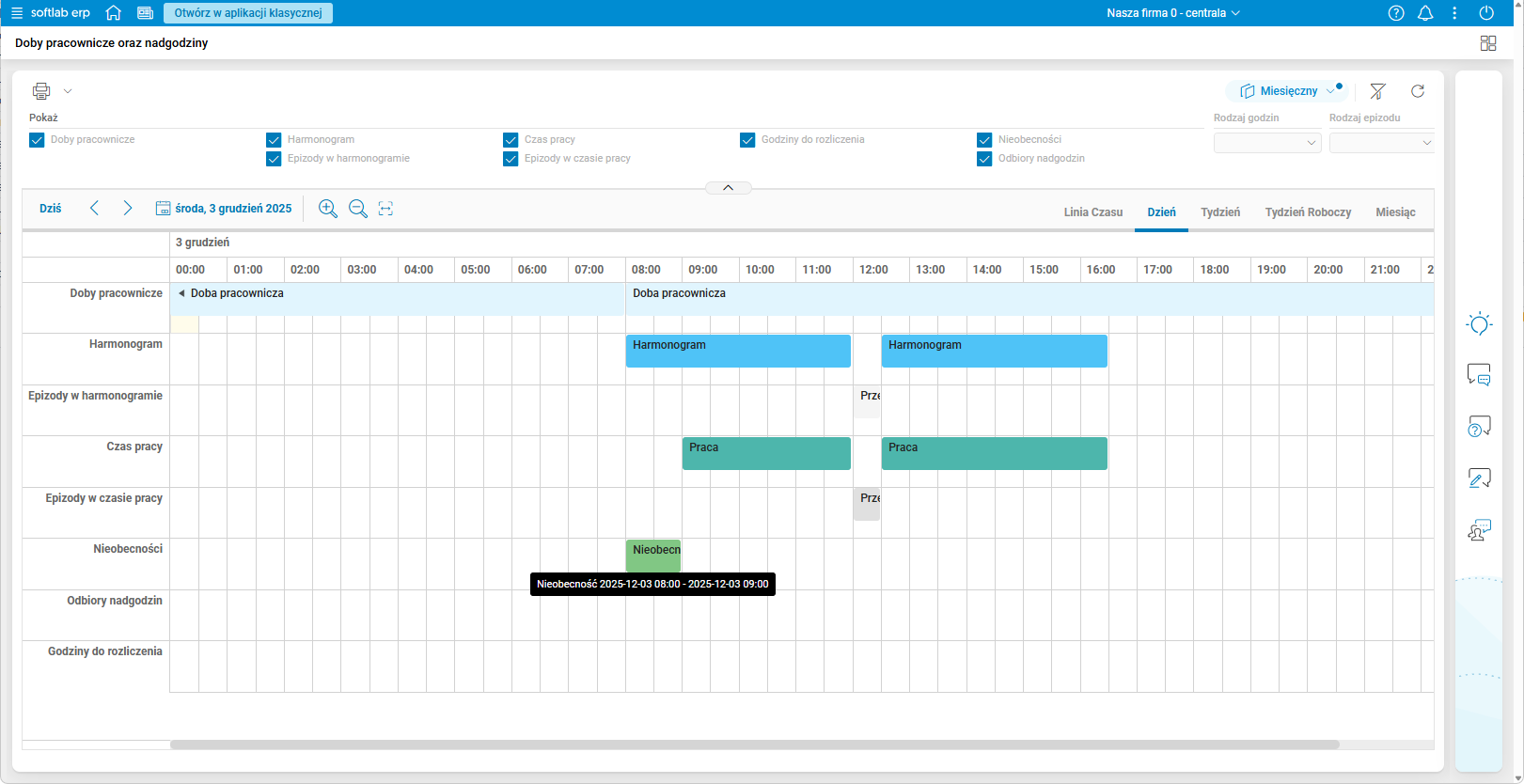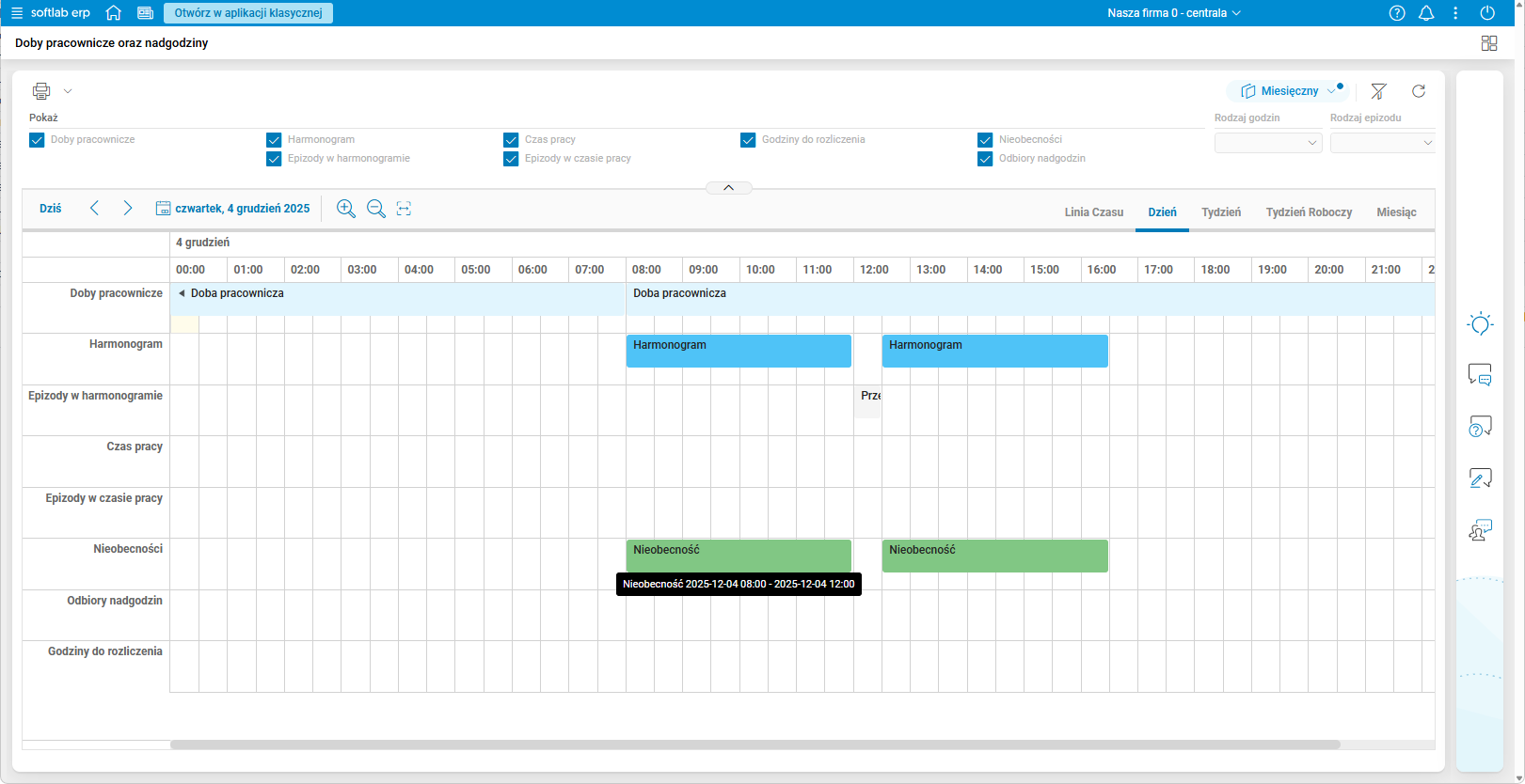 Rys. 19. Podgląd szczegółu Doby pracownicze oraz nadgodziny – włączone wszystkie filtry rodzajów godzin – zakładka Dzień, przykład nieobecności na cały dzień