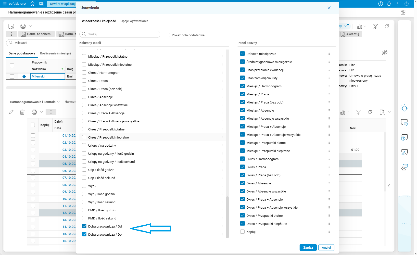 Nowe kolumny można dodać w szczególe Kontrola czasu pracy słownika Harmonogramowanie i rozliczenie czasu pracy w pozostałych przekrojach oraz w przeglądarce Kontrola RCP, włączając ich widoczność w ustawieniach tabeli: