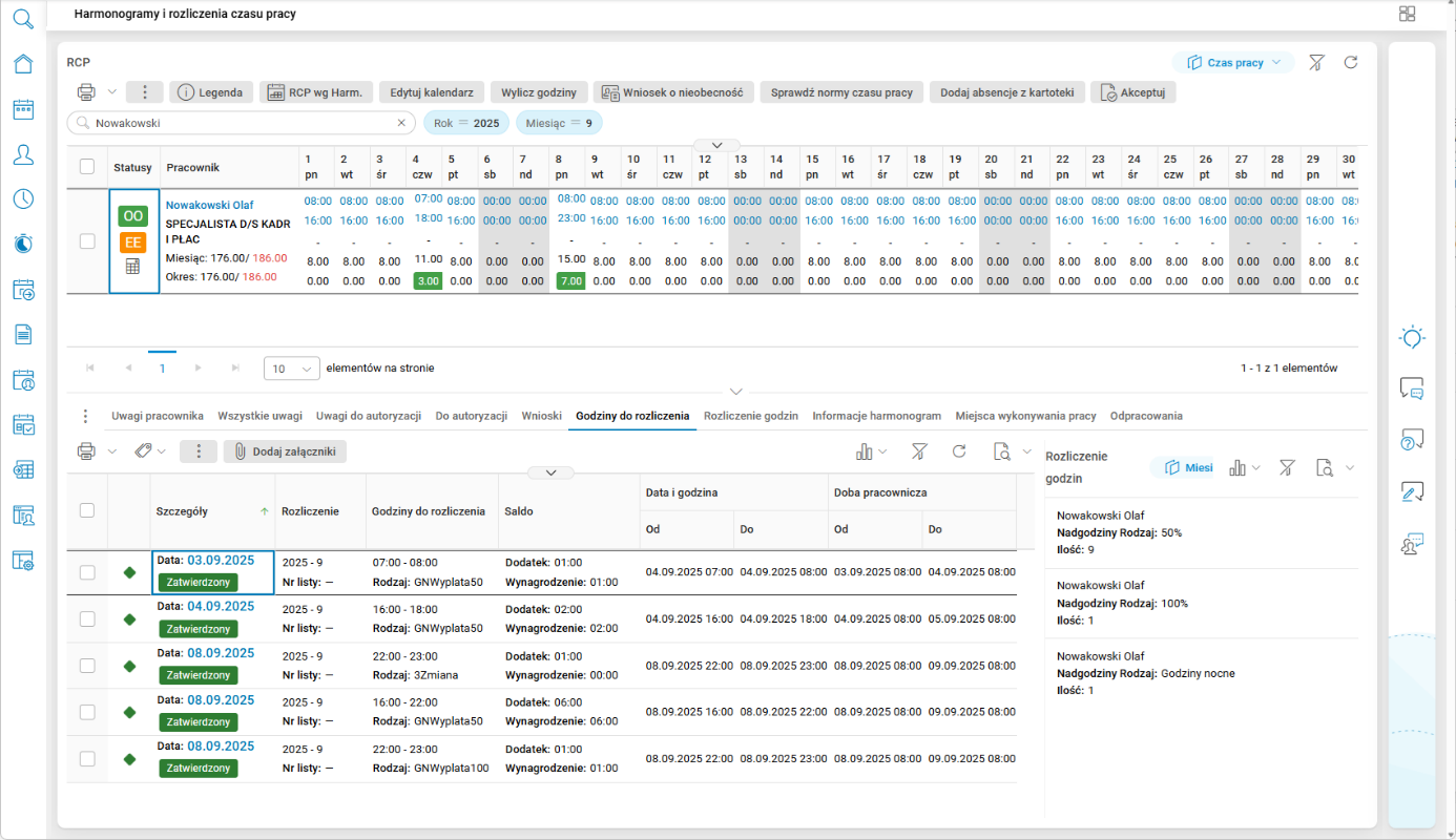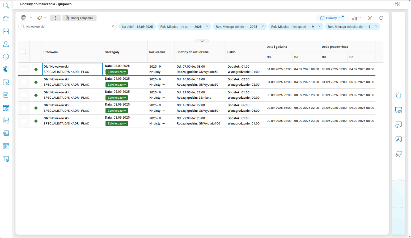 - Godziny do rozliczenia – filtr domyślnie zaznaczony – pokazuje czas wyliczonych nadgodzin i godzin dostępnych w słowniku Godziny do rozliczenia,
