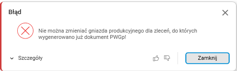 Jeśli operator wskaże gniazdo w nagłówku zlecenia produkcyjnego, a następnie wygeneruje dokument przychodu z produkcji PWGp edycja gniazda w nagłówku zlecenia zostanie zablokowana. Próba edycji tego pola spowoduje wyświetlenie poniższego komunikatu.