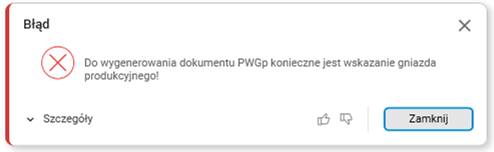Rys. 3. Komunikat pojawiający się przy próbie wygenerowania PWGp bez określonego gniazda