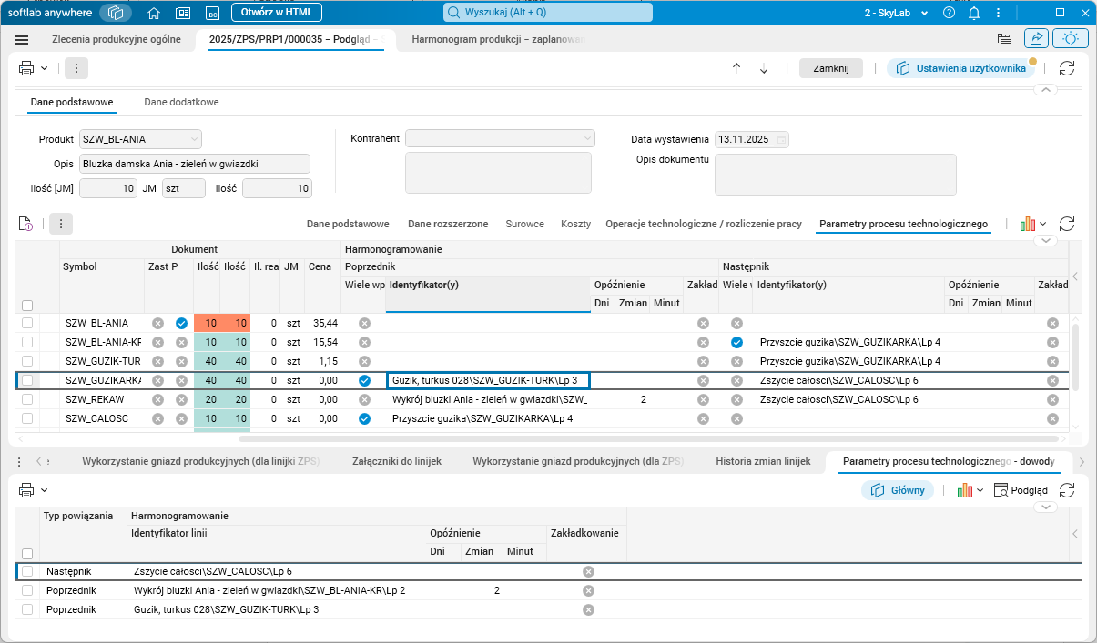- szczegół Parametry procesu technologicznego – dowody, który umożliwia prezentowanie pełnej informacji w przypadku, gdy jest więcej powiązań danego typu niż 1, sytuacja taka sygnalizowana jest aktywnym znacznikiem w kolumnie Harmonogramowanie;Poprzednik;Wiele wpisów lub Harmonogramowanie;Następnik;Wiele wpisów.