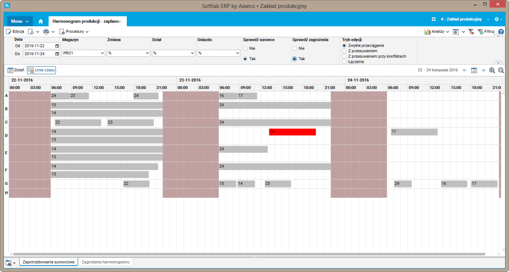 Obecnie w oknie harmonogramu produkcji systemu Asseco Softlab ERP, osobie zarządzającej wyświetli się alert informujący o zagrożeniu wraz z opisem problemu (np. awaria maszyny lub absencja pracownika). Z tego poziomu możliwa jest natychmiastowa reakcja – zmiana przydziału zlecenia do zasobu, czy kolejności zadań.
