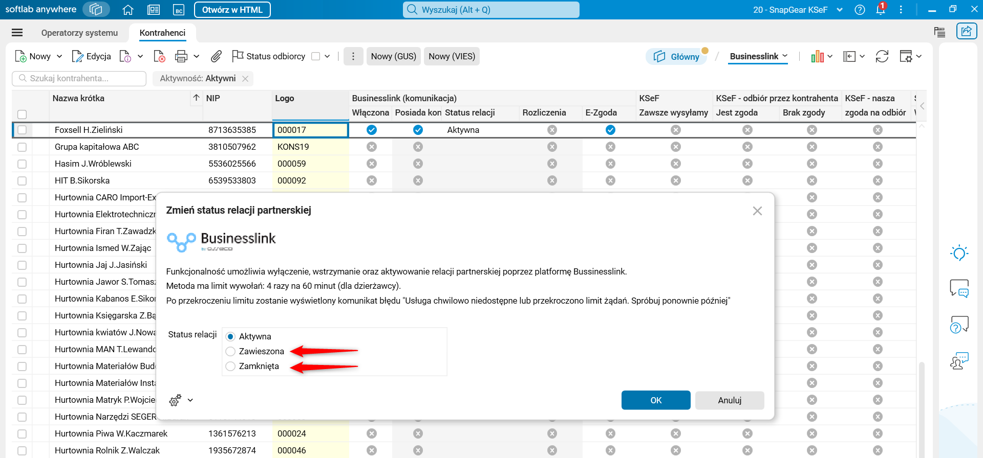 Obecnie dzięki procedurze Zmień status relacji partnerskiej Administrator Usługi może dokonać zmiany statusu relacji z wybranym kontrahentem w Softlab ERP. Zawieszenie relacji może być przydatne np. w przypadku braku wpłaty należności (np. za fakturę). Z kolei wyłączenie relacji może być stosowane w sytuacji zakończenia współpracy z kontrahentem. Relację można przywrócić, wybierając ponownie status Aktywna.