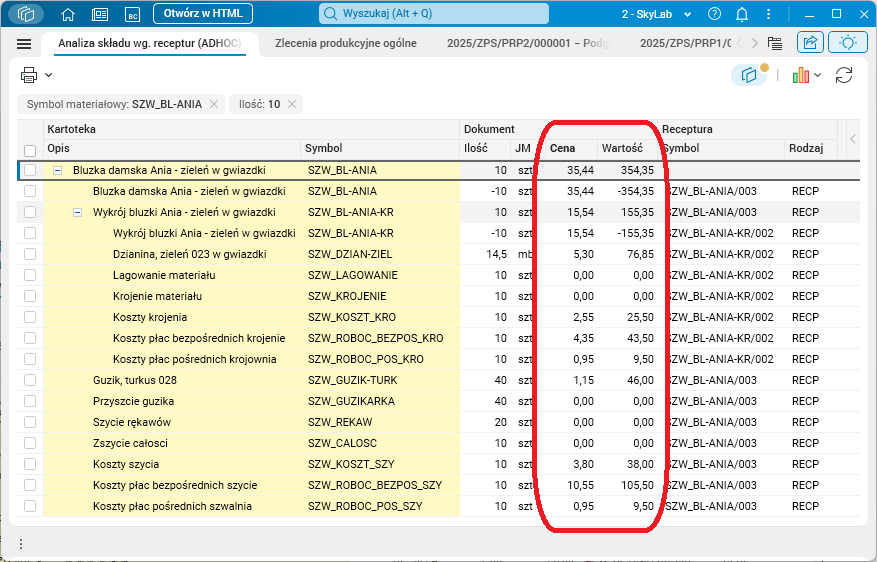 W przypadku zleceń produkcyjnych ZPS i specyfikacji ofert SPECOF mechanizm wprowadzony zmianą wypełnia cenę (w kolumnie Dokument;Cena) oraz wartość (kolumna Wartość;Netto) na linijkach rozchodowych i kosztowych, a następnie wylicza wartość pozycji przychodowych zgodnie ze wzorem: suma wartości pozycji rozchodowych i kosztowych – suma wartości pozycji odpadów = wartość pozycji przychodowych. W przypadku wielu przychodów (np. dodatkowe produkty uboczne) wartość przychodu dzielona jest między pozycje proporcjonalnie do pierwotnej wartości (wartości z ostatniego rozliczenia kosztów produkcji) lub ilości (jeżeli wartości pierwotne były zerowe).