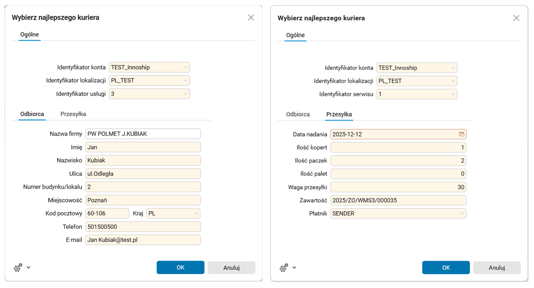 Po zatwierdzeniu tego formularza pojawi się docelowa formatka z parametrami przesyłki kurierskiej.