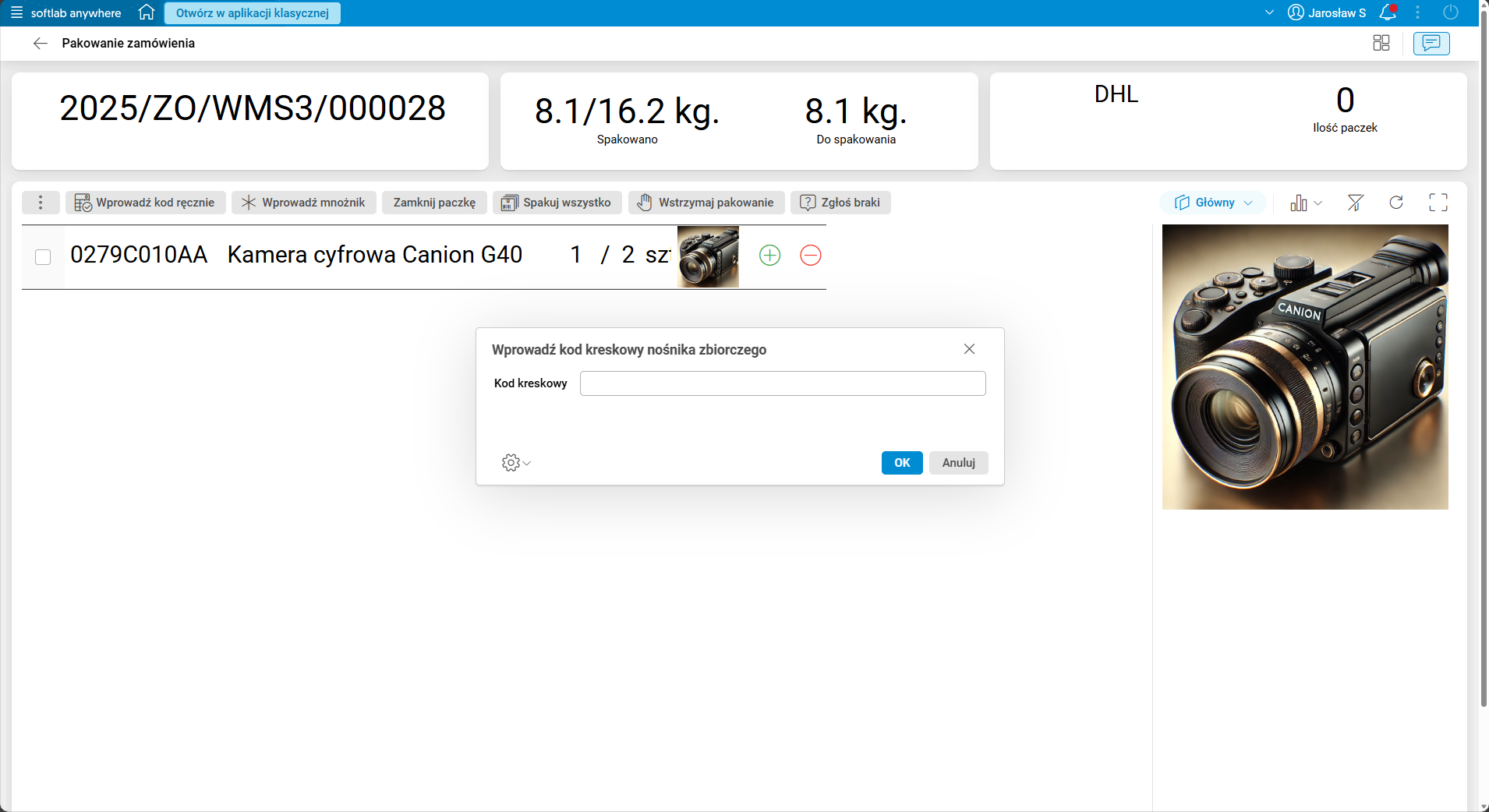 Rejestrowanie kodów z etykiet kurierskich oraz powiązanie paczek kurierskich z nośnikiem zbiorczym w procesie pakowania e-commerce