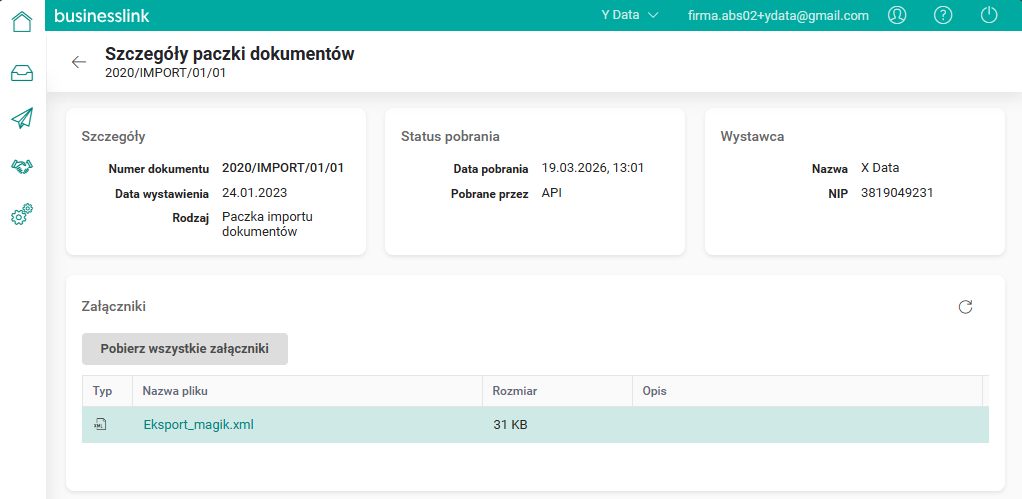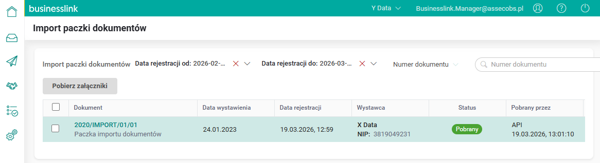 W Portalu Businesslink w menu Skrzynka odbiorcza dodano nowy pulpit Import paczki dokumentów. Umożliwia on importowanie paczek dokumentów z systemu ERP w formacie XML.