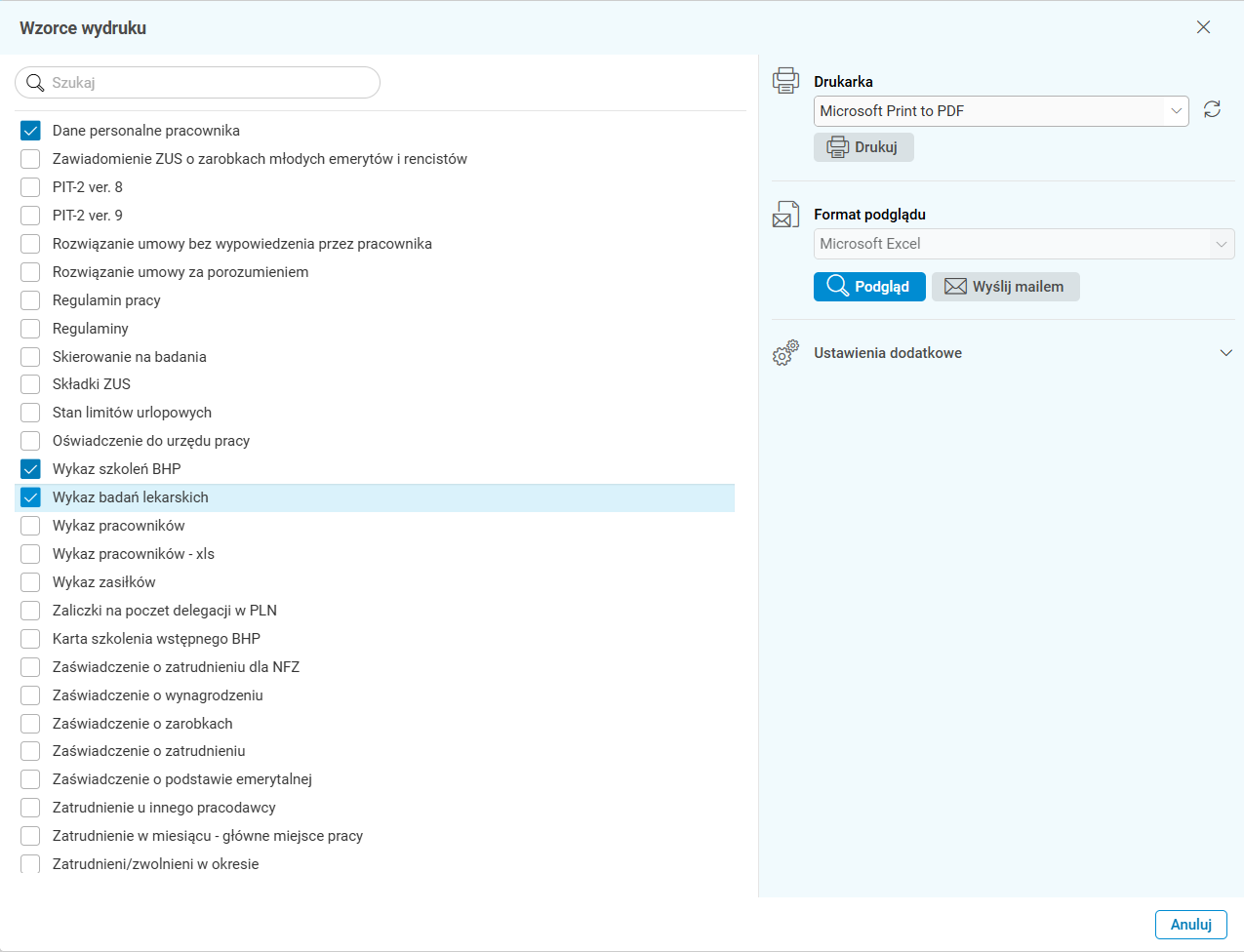 Rys. 3. Przykładowe okno Wzorce wydruku z zaznaczonymi znacznikami wyboru