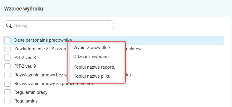 Dodatkowo po kliknięciu prawym przyciskiem myszy na wybranym wzorcu dostępne są dodatkowe opcje, które usprawniają pracę z listą wzorców wydruków i ułatwiają ich zaznaczanie oraz kopiowanie nazw: