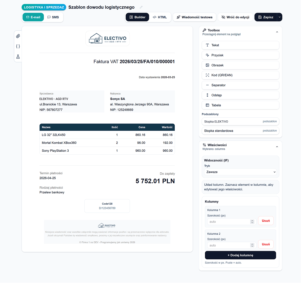 Szablon buduje się, przeciągając elementy do obszaru edytora: tekst, przycisk z linkiem, obrazek, tabela, separator, odstęp oraz kody QR i kreskowe różnych standardów. Elementy można układać w kolumnach i swobodnie zmieniać kolejność.