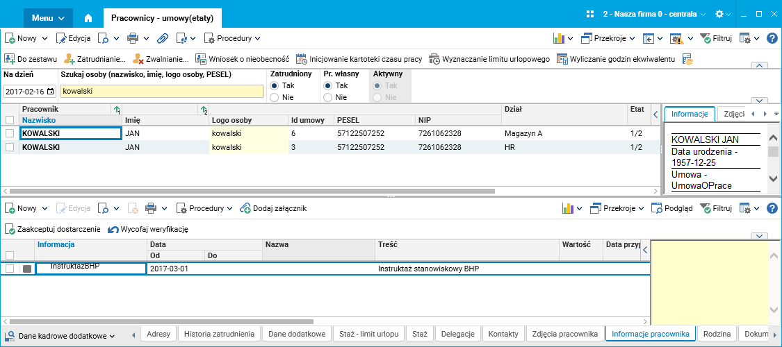 Wygenerowany dokument można zobaczyć w szczególe Informacje pracownika w słowniku Pracownicy – umowy(etaty). Status wymaganego dokumentu zostanie ustawiony na Wpisany. Jeżeli zadanie Generowanie wymaganych dok. dla badań/kursów/szkoleń wykryje, że jest już zarejestrowany wymagany dokument w szczególe Informacje pracownika, tzn. że dla danego pracownika istnieje dany rodzaj informacji z tą samą datą „od”, to taki dokument nie zostanie ponownie wygenerowany.