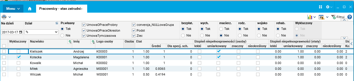 W przeglądarce Pracownicy – stan zatrudnienia na dzień (ZPCH) dodano kolumnę oraz filtr Wykluczony, pozwalające na prezentację osób, które z uwagi na absencję nie zostały uwzględnione w stanach dziennych. Umożliwia to ustalenie stanu zatrudnienia, z uwzględnieniem wyłączeń wymienionych w art. 21 ust. 5 ustawy o rehabilitacji zawodowej i społecznej oraz zatrudnianiu osób niepełnosprawnych.