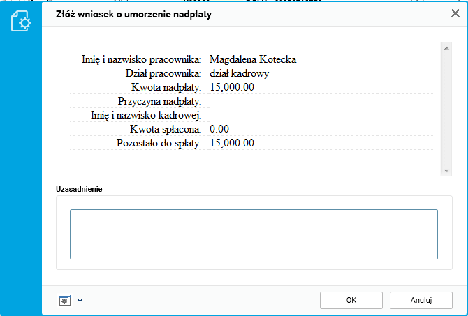 Procedura Złóż wniosek o umorzenie nadpłaty dostępna w szczególe Zajęcia wynagrodzeń – definicje w słowniku Pracownicy – umowy(etaty) pozwala na umorzenie nadpłaty. Żeby go wprowadzić, użytkownik podaje jedynie uzasadnienie decyzji.