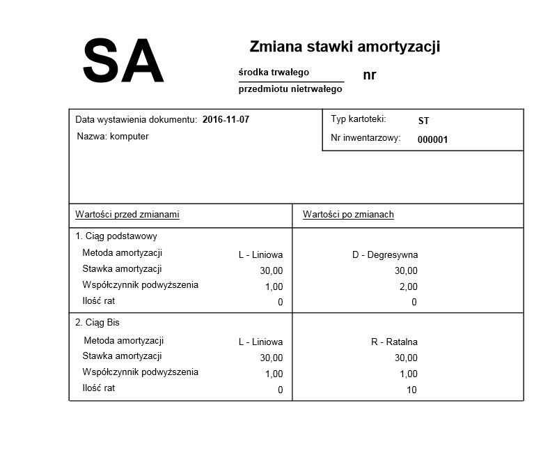 Wydruki dostępne są z poziomu słowników tych dokumentów. Przedstawiają wartości zmieniane dokumentami. Dla dokumentu SA będą to: metoda amortyzacji, stawka amortyzacji, współczynnik podwyższenia i ilość rat przed zmianą, a także po zmianie dla obu ciągów.