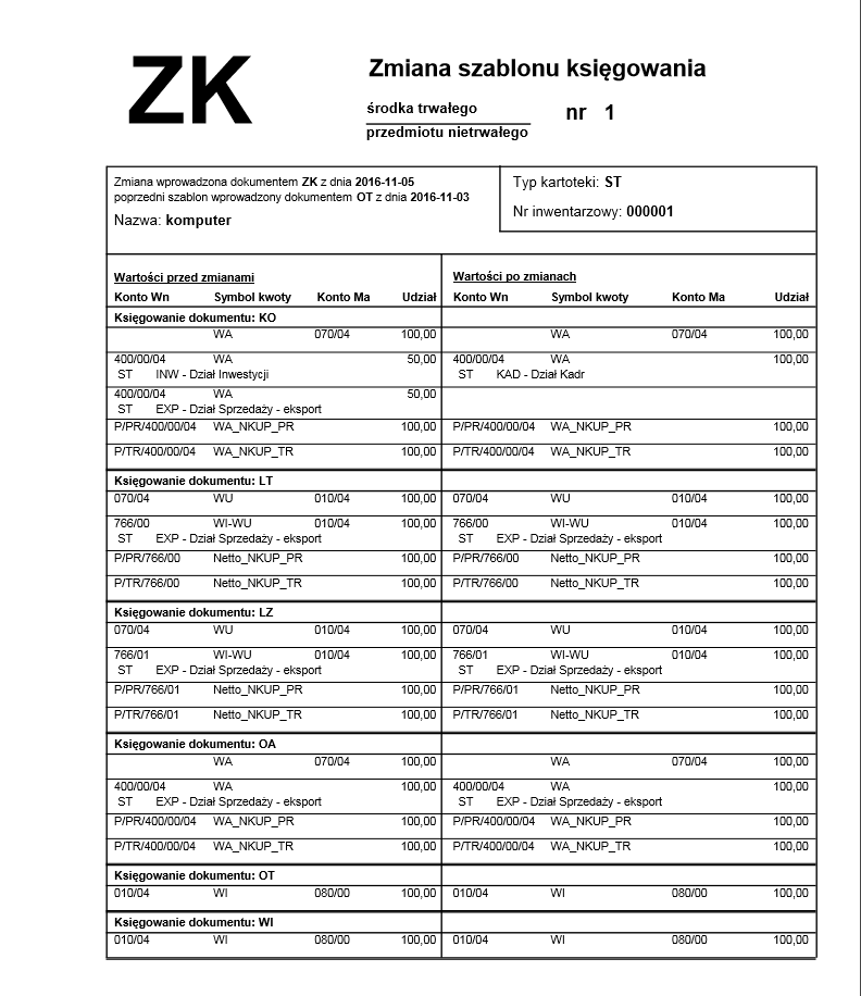 Dodano wydruki pojedynczych dokumentów SA (zmiana stawki) i ZK (zmiana szablonu księgowania). Wydruki wykazują zmiany w księgowaniach kartoteki i uzupełniają informacje o historii kartoteki.