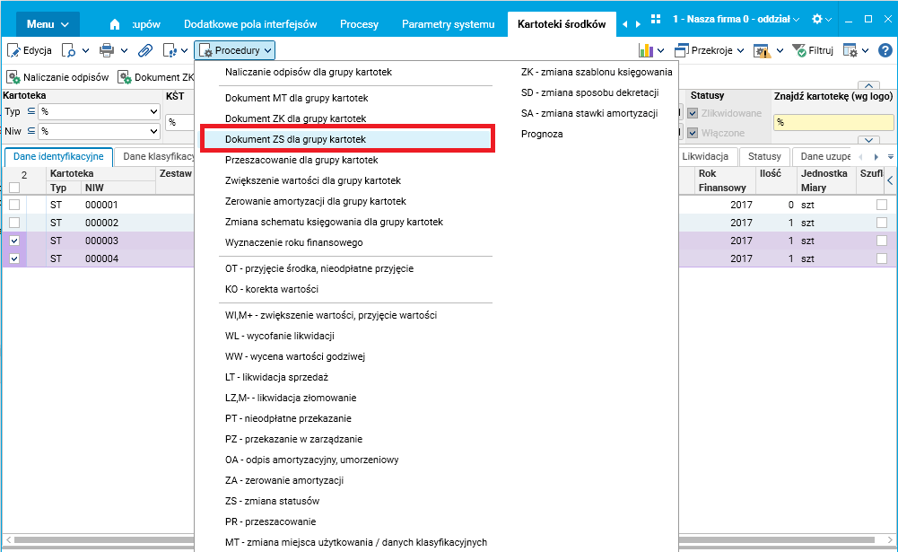 Dodano możliwość wykonania operacji ZS – zmiana statusu dla grupy kartotek. Operacja dostępna jest z menu Procedury słownika Kartoteki środków. Taka procedura jest przydatna w przypadku, gdy firma zawiesza naliczanie amortyzacji dla grupy środków na jakiś okres i po upływie tego okresu przywraca naliczanie z powrotem. Wcześniej trzeba było wystawiać te dokumenty pojedynczo dla każdej kartoteki.