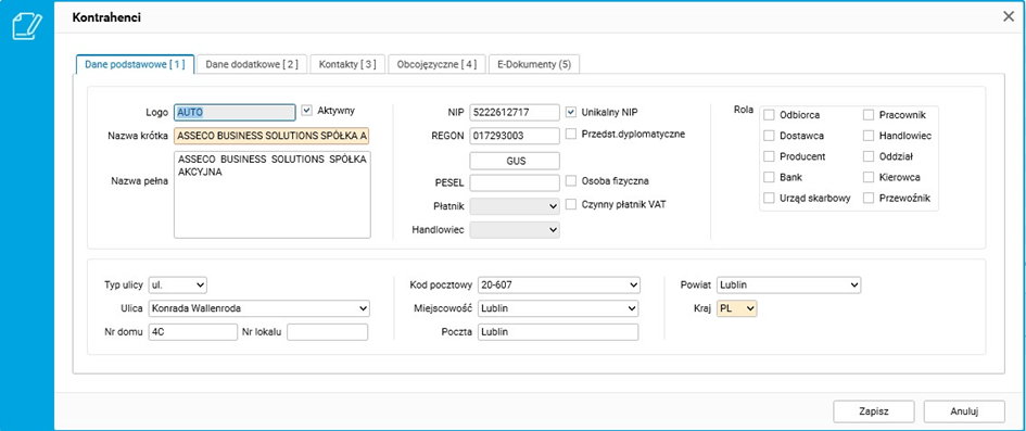 Po wyborze jednej z dwóch opcji otwiera się okno dodawania nowego kontrahenta z zainicjowanymi polami. Pola te są uzupełnione informacjami pobranymi z bazy GUS na podstawie podanego numeru NIP, REGON lub KRS.