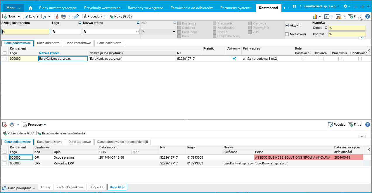 · w oknie edycyjnym kontrahenta znajduje się przycisk GUS, który na podstawie wcześniej wpisanych numerów NIP lub REGON wczytuje dane z GUS i prezentuje je w oknie edycyjnym,