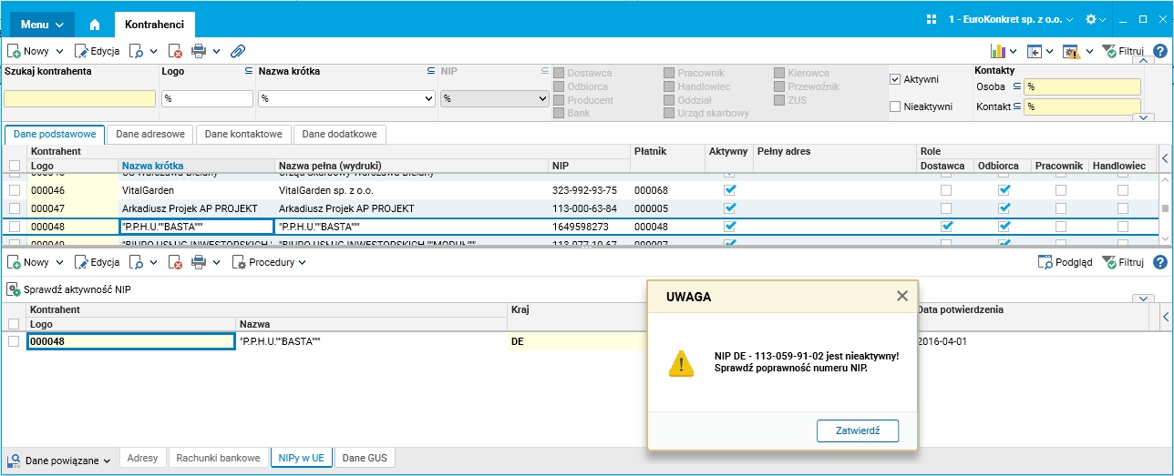 W szczególe NIPy w UE słownika Kontrahenci dodana została procedura Sprawdź aktywność NIP. Mechanizm łączy się z bazą VIES i sprawdza aktywność numeru VAT.